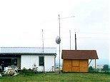 (17) PD02. Vlevo pomocná 4xDK7ZB na 70cm, uprostřed parabola 13cm, hlavní anténa pro 70cm a příposlechová anténa na 70cm, vzadu vpravo stožár s yagi pro 23cm.