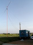 (25) VHF02. Západ slunce za stožáry pro 144 MHz. 1x 18el. otočná a 1x 10el. pevně, 7el. QUAD na příjem a 10el. na vysílání na druhém stožáru.